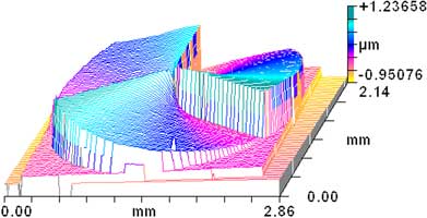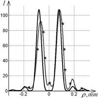 Микрорельеф СФП (n=3), формирующей оптический вихрь в ближней и дальней зонах дифракции, сравнение расчета и эксперимента (звездочки) для радиального сечения лазерного вихревого пучка.