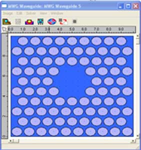 Разработан метод согласованных синусоидальных мод для расчета электромагнитных мод фотонно-кристаллических световодов, в котором задача поиска констант распространения мод решается как нелинейная задача на собственные значения с помощью рационального метода Крылова. Разработан также метод расчета электромагнитных мод фотонно-кристаллических световодов, основанный на независимом решении двух линейных матричных задач на собственные значения, получаемых в результате применения конечно-разностных аппроксимаций к векторным волновым уравнениям относительно электрической и магнитной составляющих электромагнитного поля. С помощью разработанных методов проведено численное исследование модового состава оптических световодов с оболочкой в виде двумерного фотонного кристалла. На иллюстрации – сечение фотонно-кристаллического световода с параметрами: материал световода – плавленый кварц (n=1,46), отношение длины волны к периоду решетки отверстий – 0,6, отношение диаметра отверстий к периоду – 0,94, сетка отсчетов – 204х228, дискретность поля – 0,03 от периода. И интенсивность фундаментальной моды, рассчитанная для длины волны λ = 600нм. |